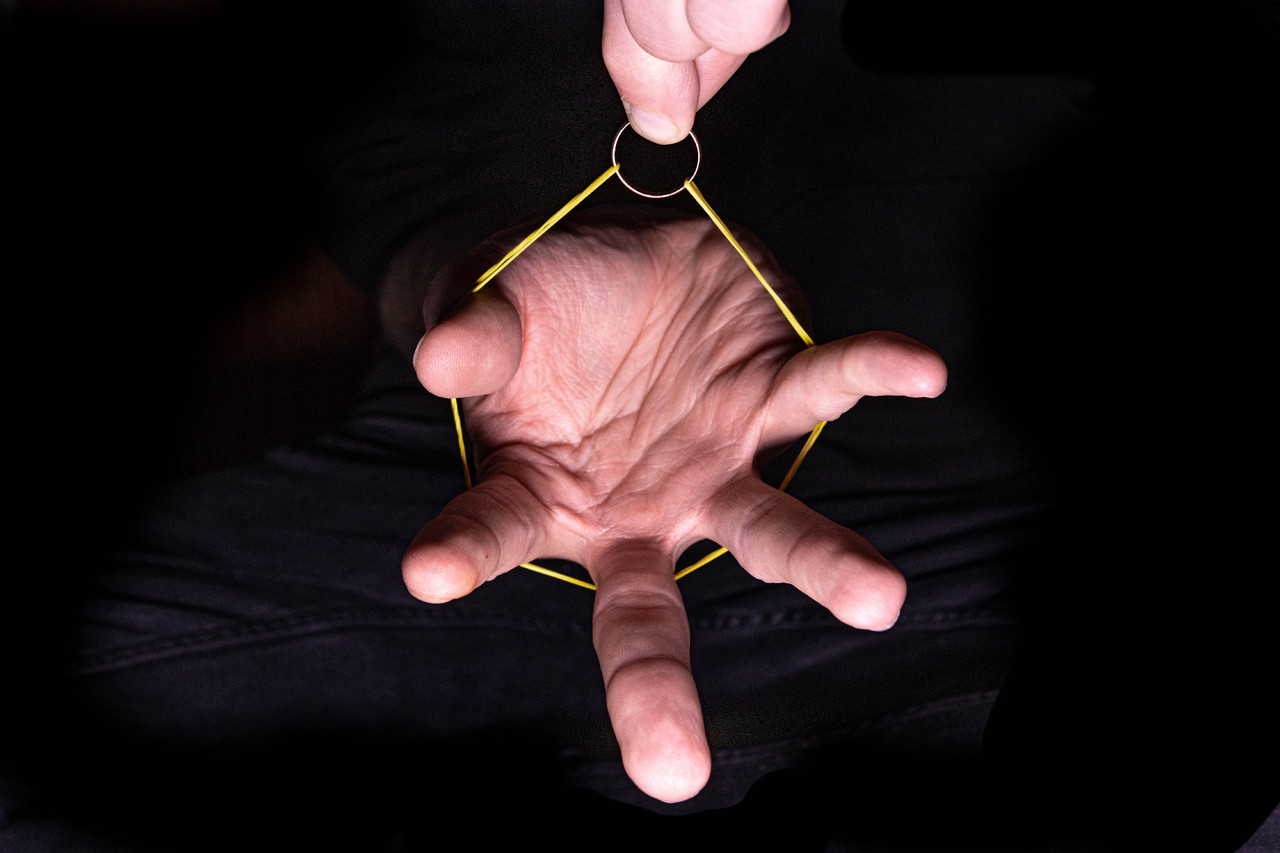 - Black Gate: a borrowed pen (or your finger, or any other thin object) is clearly trapped between three threads of a regular rubber band and firmly hold on both extremities by your spectator. In the blink of an eye, it escapes!