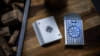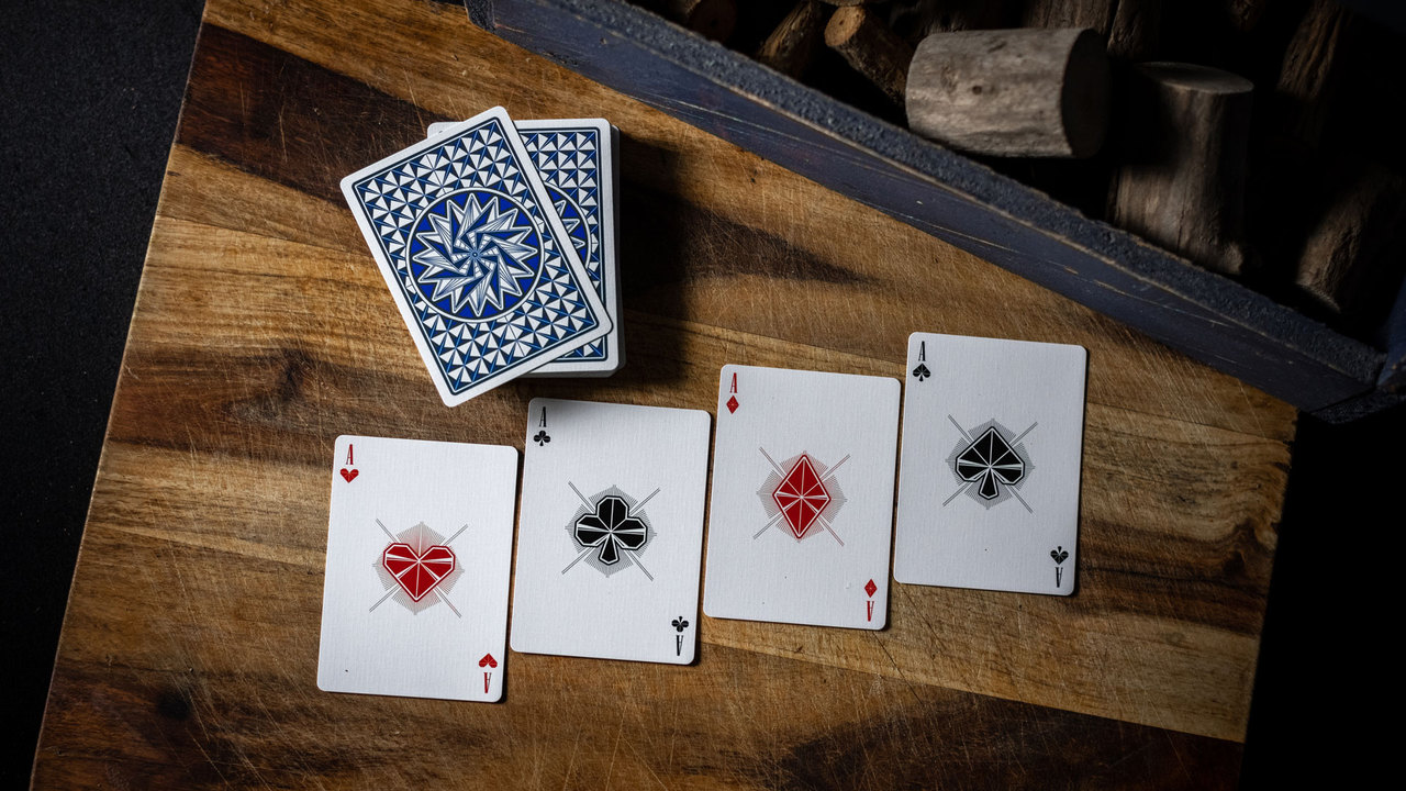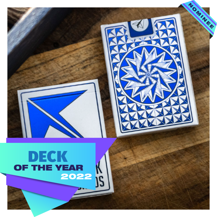 The Glider Back deck is a 100% custom deck of playing cards featuring origami-inspired artwork. The back design has paper gliders arranged in an appealing geometric layout against a classic blue background. The traditional-looking back also contains a devious but easy-to-learn coded marking system designed by Kevin Reylek that allows you to identify the suit and value of each card.