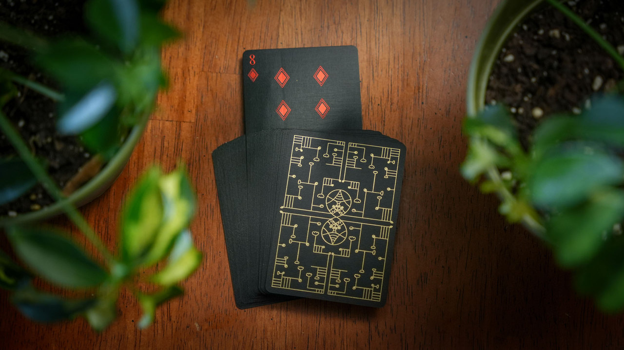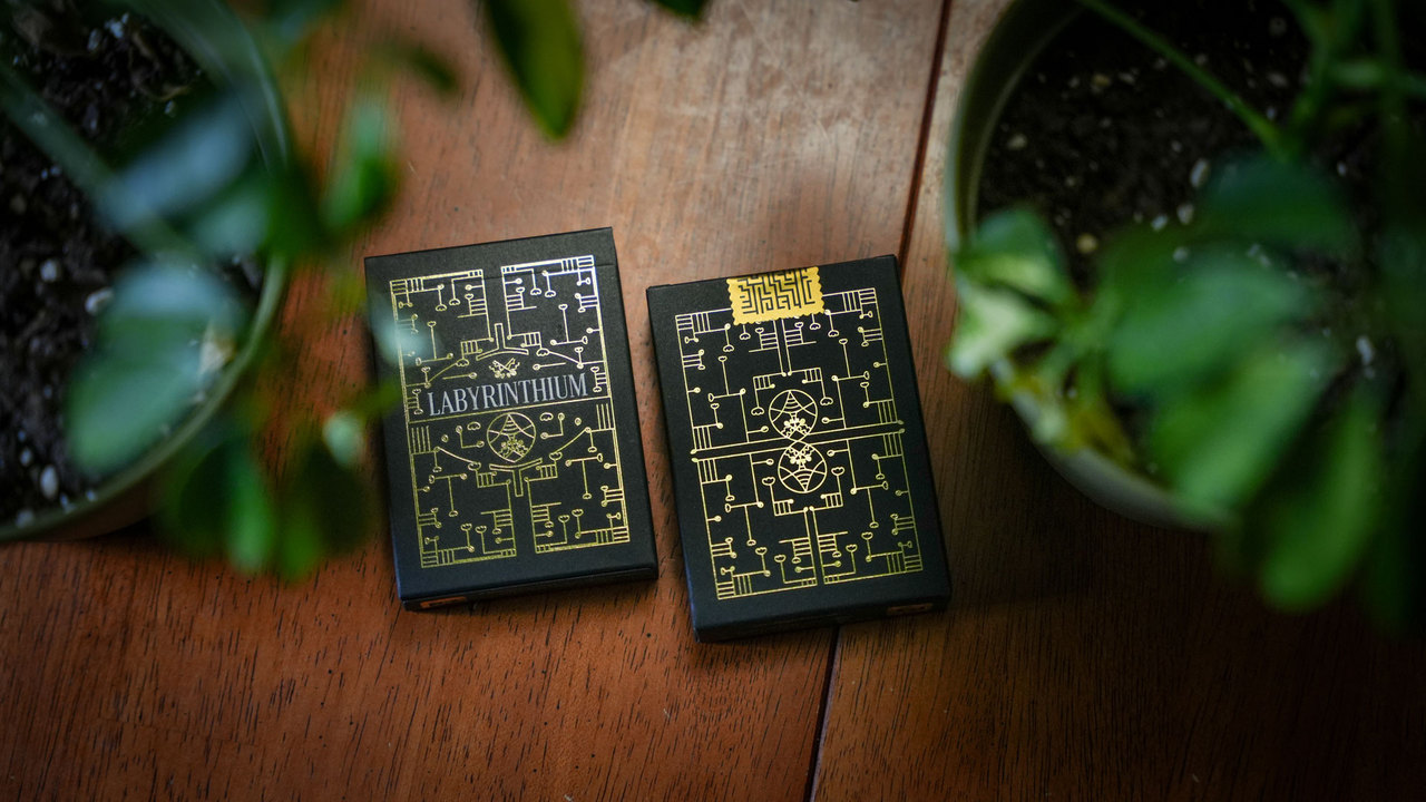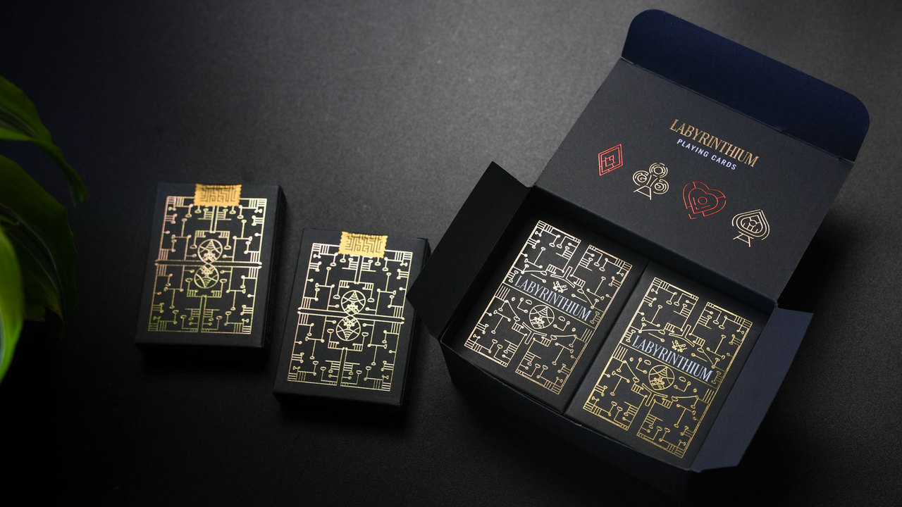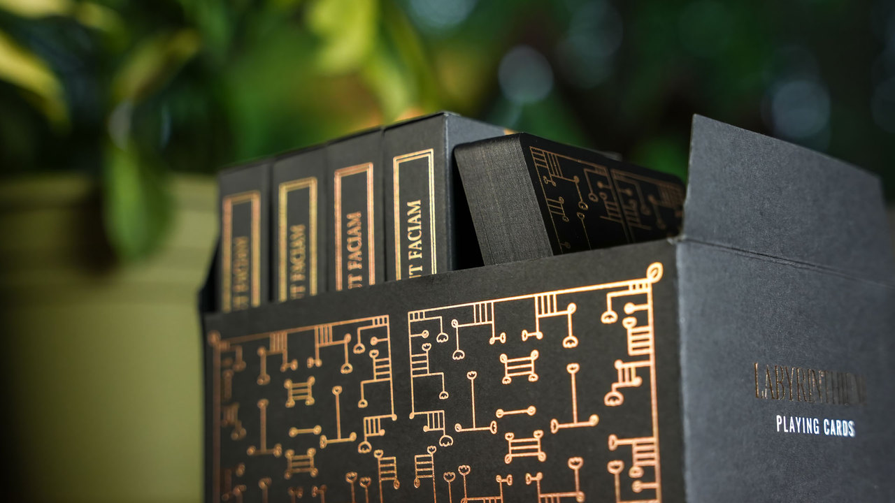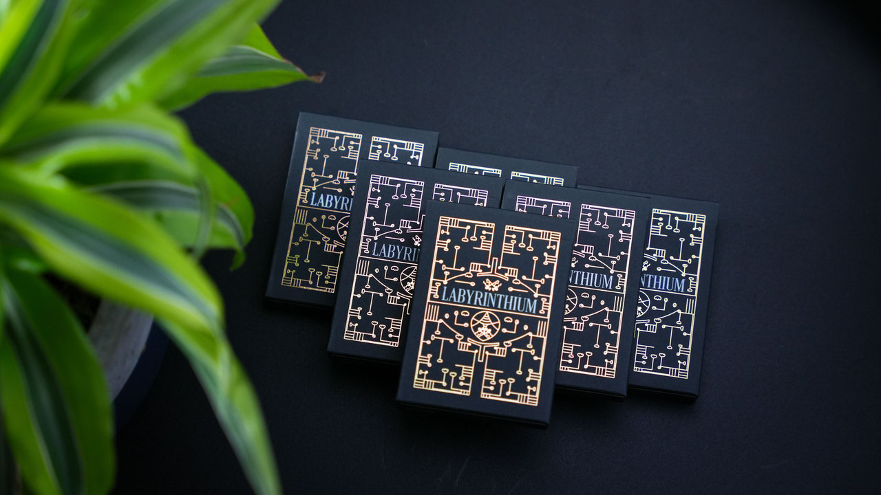 Labyrinthium playing cards feature UltraLux™ Finish and AquaFlow™ Coating. This blend of casino-grade European card stock and water-based coating, with a perfect linen texture and vegetable-based inks results in a deck that handles like an absolute dream. The cards are traditionally cut with smooth edges that provide just the right amount of grip. These cards are soft enough to get to work straight out of the box, but durable enough to meet the needs of a full-time magician, cardist, or card sharp.