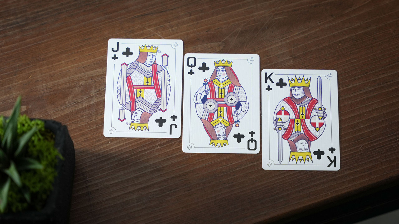 The faces use custom fonts, new pip designs & layouts on the number cards, and custom court card designs. Despite the customization, the faces maintain enough familiarity to be suitable for all tricks and games.