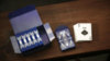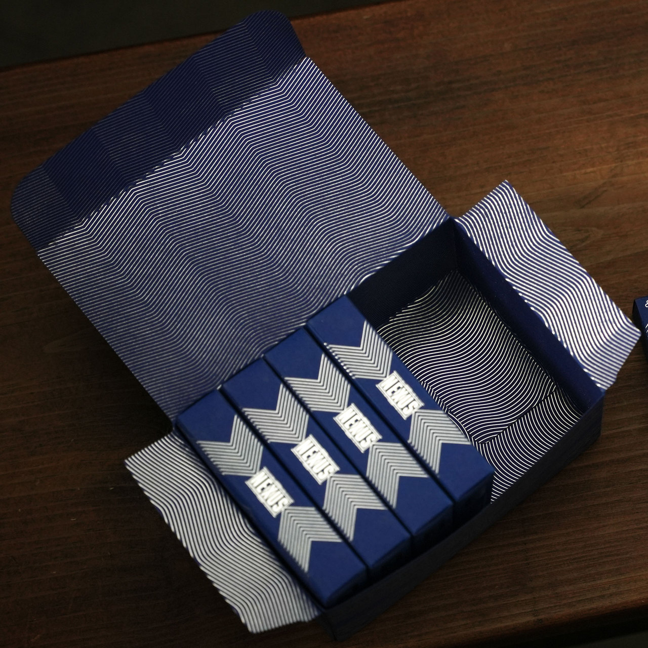 The box is made from a premium matte blue paper with all of the design work stamped in luxurious silver foil inside and out. The box is sealed with an individually-numbered foil stamp.