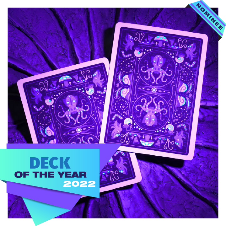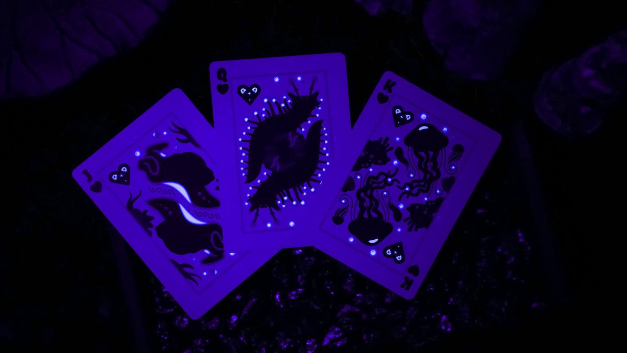 Designed by Douglas Fuchs, the Bioluminescent deck has 100% custom artwork featuring sea creatures, insects, fungi, and more. All of the art of the backs, faces, and the tuck box are accented by special UV ink that glows under a blacklight*.