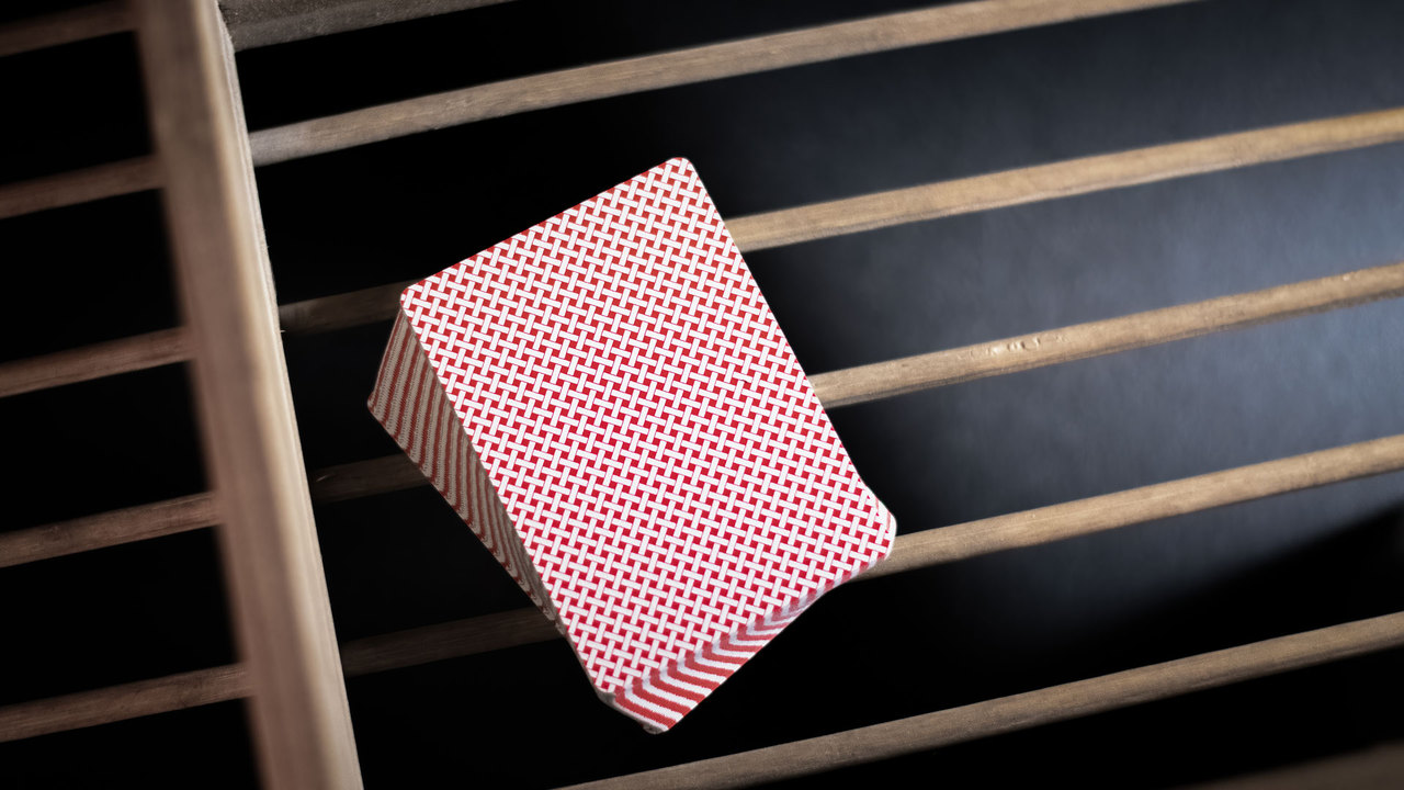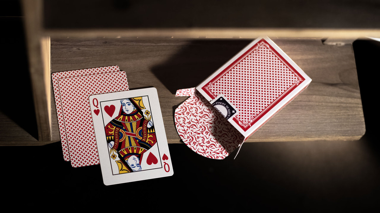 The cards feature a simple, borderless woven pattern on the backs that is reminiscent of the daily poker decks of years gone by. The deck uses Penguin's custom standard faces, Jester jokers, and a custom Ace of Spades. A blank face and a double back card are included.