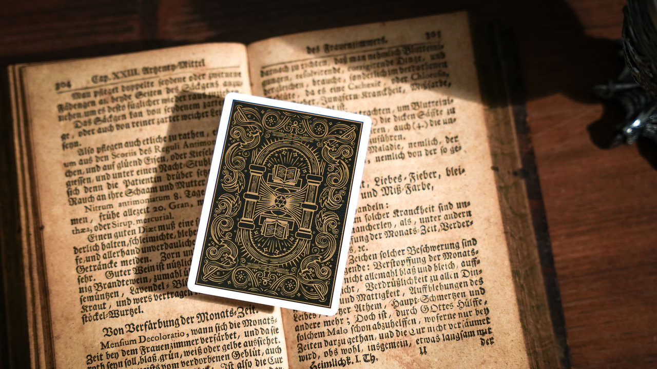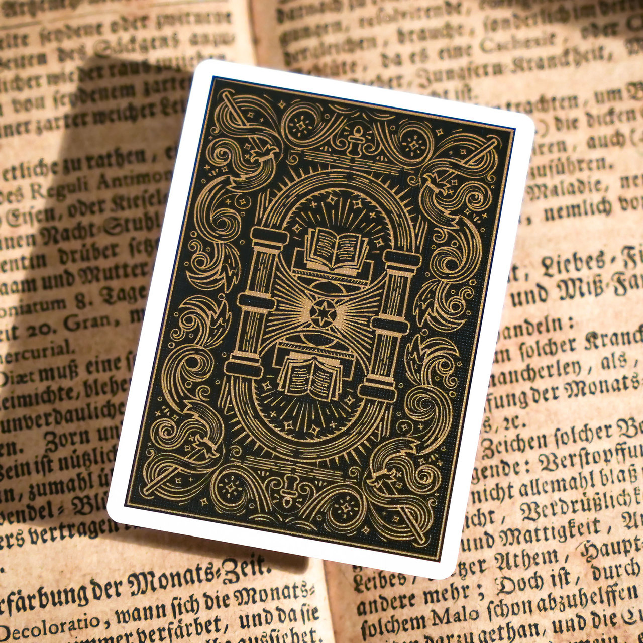 The black & metallic gold back design features the Sorcerer's spellbook, the enchanted brooms, and of course the waves of unending water. The design also contains an openly-readable marking system that allows you to secretly learn the suit & value of a card, just by looking at its back!