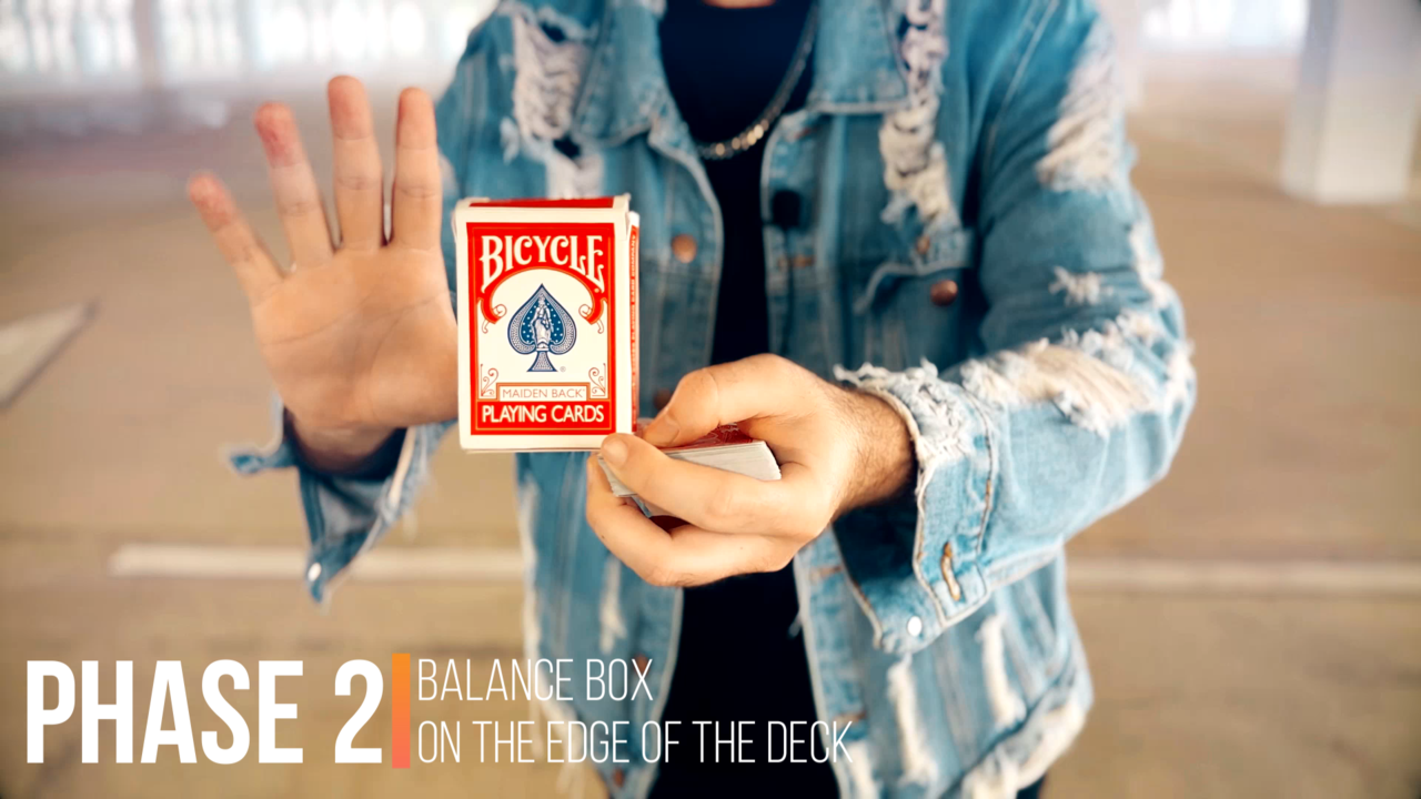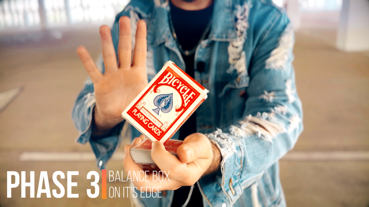 You tell your audience that you’ve been using a breathing technique that allows you to achieve perfect stillness, and you can prove it. You begin by removing a deck of cards from the box and balancing the loose deck on just two fingers. You then take it a step further by resting one corner of the box on the deck. The box is clearly over its center of balance and should fall, but it appears to ignore the laws of gravity. Then, you tilt the box over so that it is balanced at an impossible angle on just the smallest edge of the box. You can then pluck the box off of the deck and hand it out for immediate examination.
