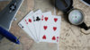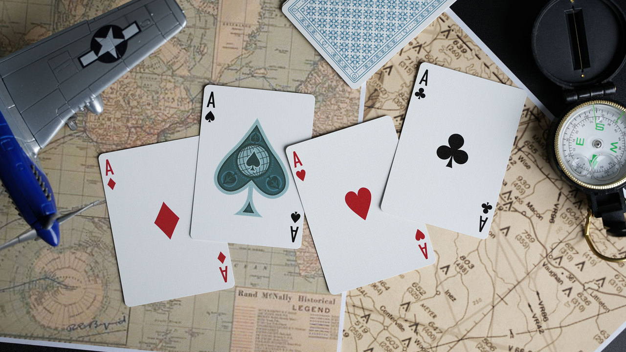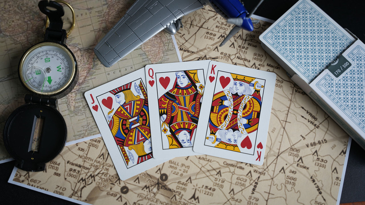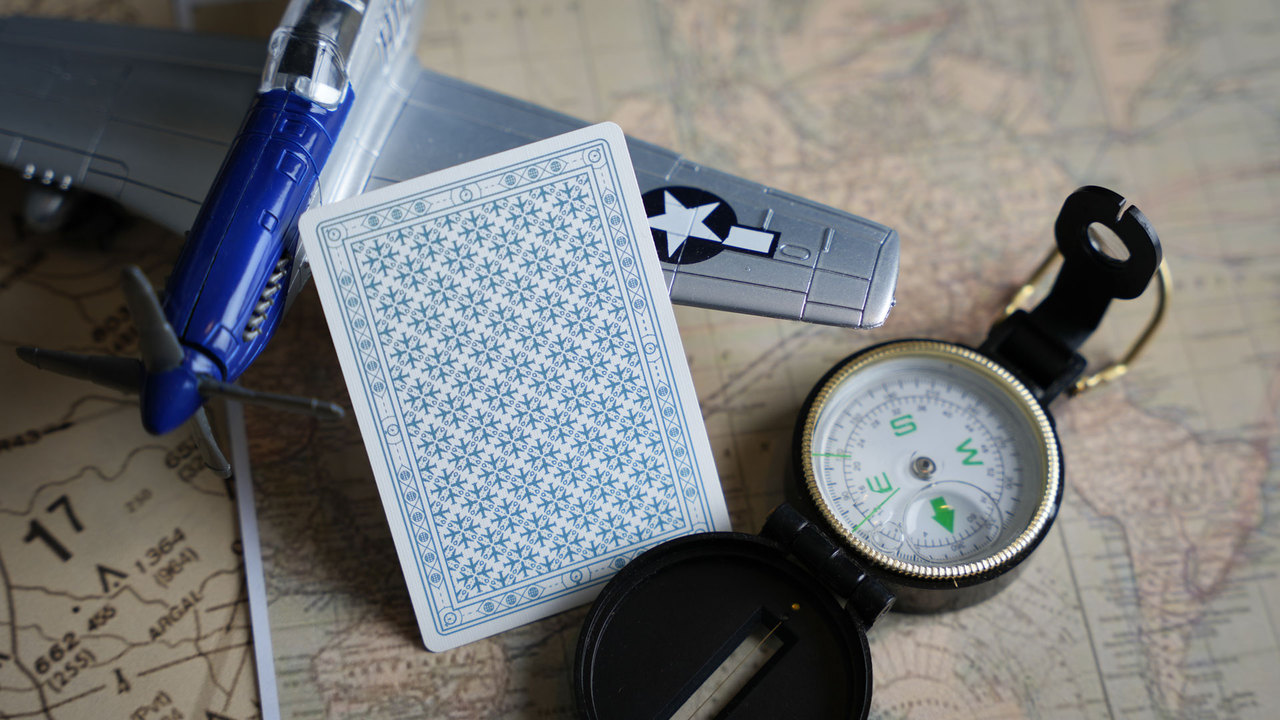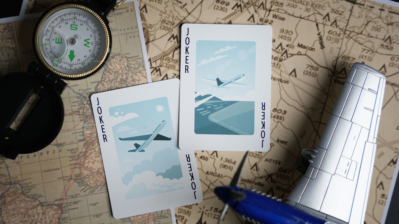 The back design features airplanes & clocks in a patterned design with a white border. The blue-green color scheme is the perfect choice for a timeless deck. The faces include a custom Ace of Spades and two custom Jokers alongside the Penguin Custom Standard court & number cards. Two gaff cards are included for magic tricks.
