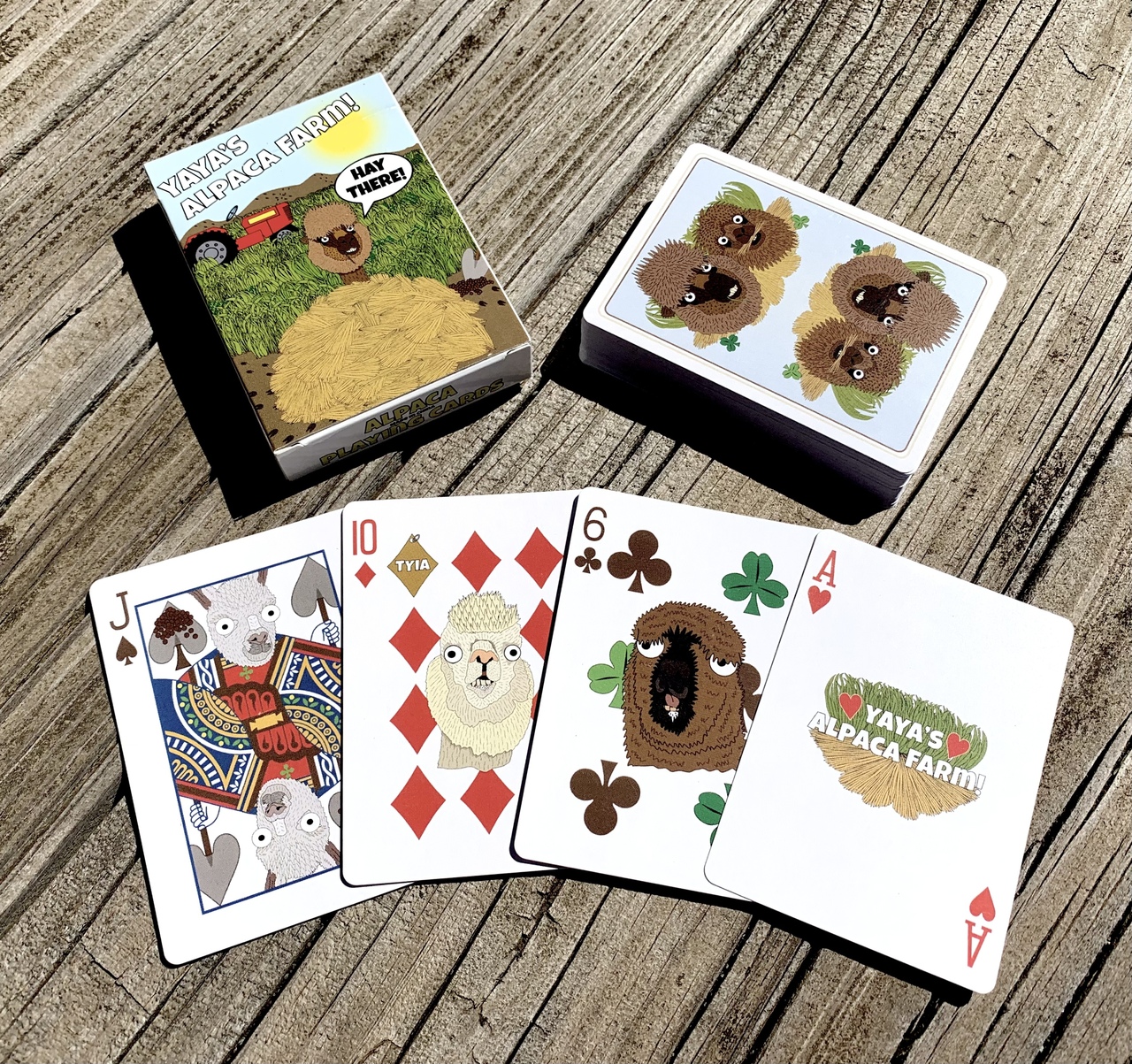 Inspired by alpacas at Yaya’s Alpaca Farm in Garden City, MO, this fully customized deck brings a cute and fun vibe to your favorite card games or collection. The cards features 13 of the farm’s beloved alpacas. Designed by Mike Blandin, they bring the love, warmth and quirkiness of these animals directly to your home.