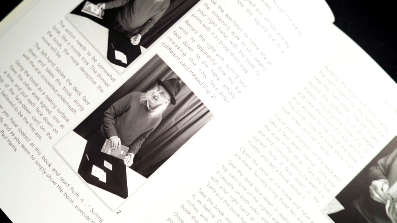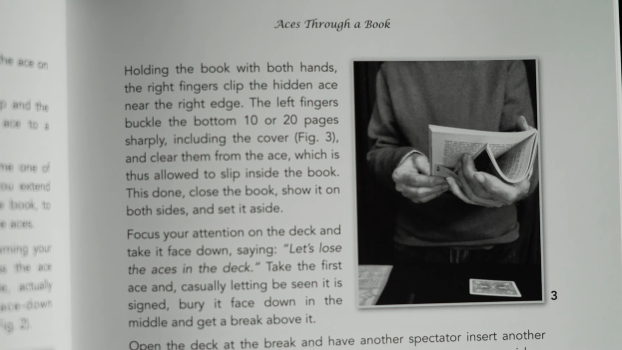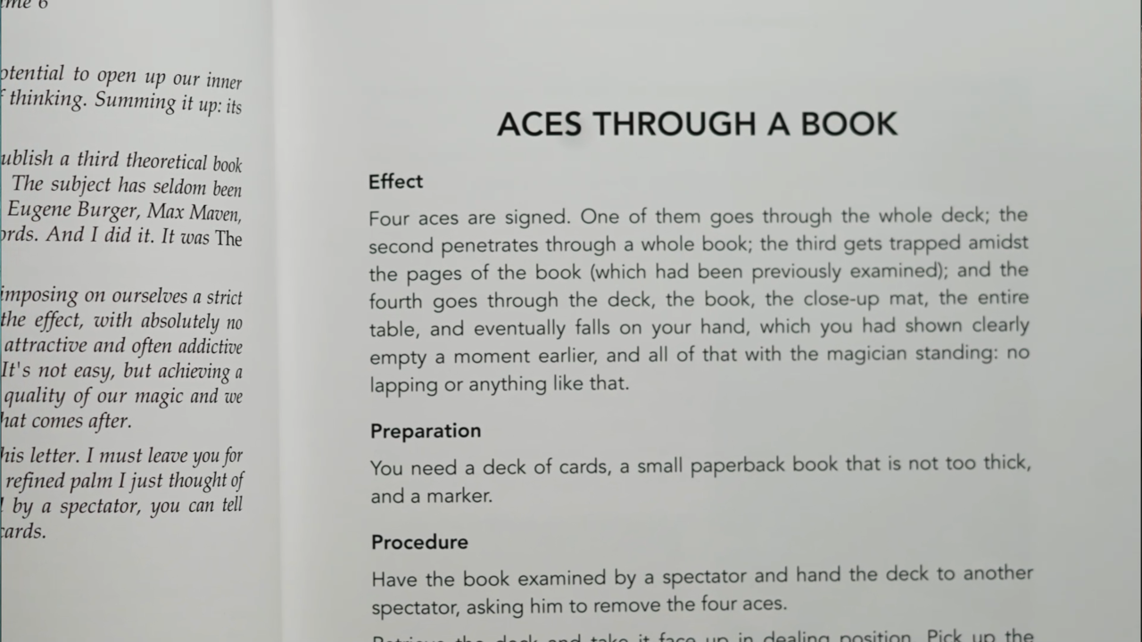 A brilliant solid through solid effect performed with four signed aces! One ace penetrates the deck. The second ace passes completely through the book. The third is found in the middle of the book, even after a spectator has examined it! The fourth ace has to be seen to be believed.