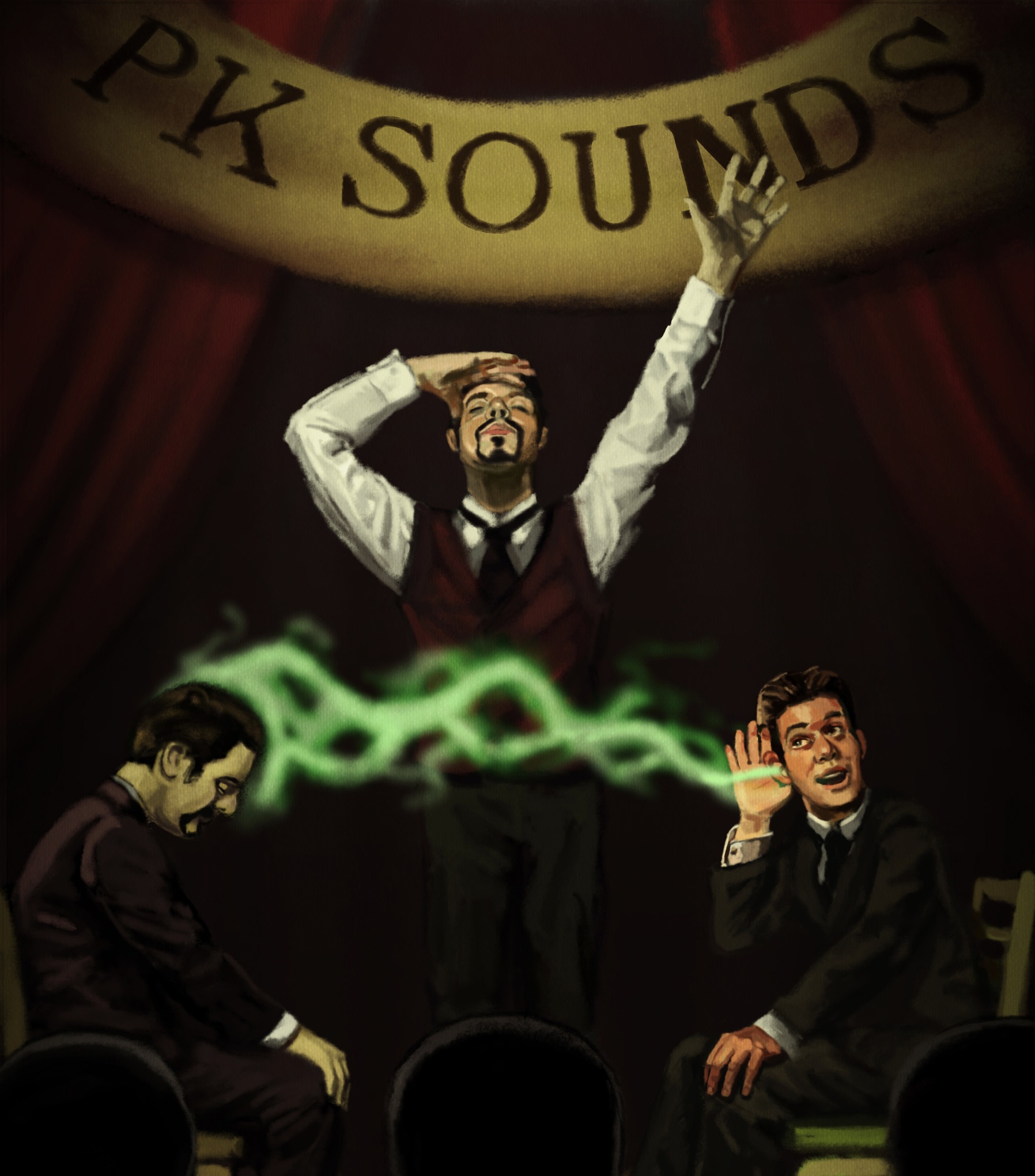 The performer brings up two spectators to the stage and seats them facing each other, ten feet apart with their heads down and their eyes closed. The performer moves to the front of the stage and addresses the audience about different types of supernatural phenomena between friends or even complete strangers. He begins his experiment.