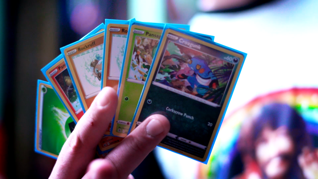 one worthless energy card and places it atop of his more valuable Pokémon cards in a hopeless
