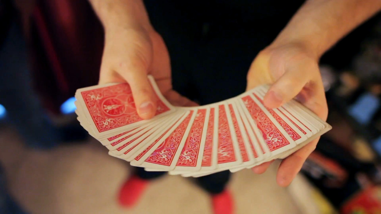 You introduce a blue deck of cards. Your spectator selects a card. The deck is shuffled face-up into face-down. The card is lost into the deck. The deck then visually sorts itself out with the exception of the selection. In an impossible kicker every single card changes from blue to red IN MID-AIR.