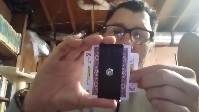 Three solid cards are shown with a hole in the middle one of the cards is placed in between the other two cards and then all three cards are secured with a nut and a bolt slowly and visually the card in between the other cards is able to escape from in between. The two cards by visually penetrating right through it the nut and bolt and all the cards used can be examined before and after the effect making for an impossible looking penetration. It's easy to create and perform