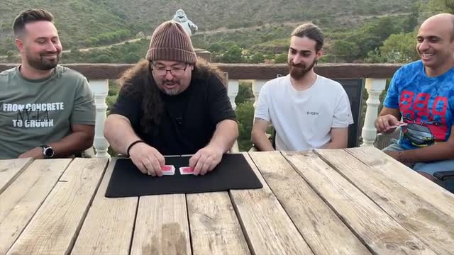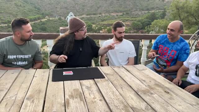 Things kick off with an immediate performance of an astonishing effect. Two spectators are asked to think of playing cards. The deck is passed out in small groups to spectators around the table and they shuffle their packets. The magician counts to three, and different spectators race to see who can put their packet onto the table first. Every time there are two packets on the table, they are shuffled together, and a spectator squares them up. Finally, when the deck has been reassembled and the cards are thoroughly mixed, the first spectator names their card. The magician shows the top card is not the one they are thinking of. With a magical gesture, the top card suddenly becomes the named card. The second spectator names their card, and just as impossibly, it rises to the top as well.