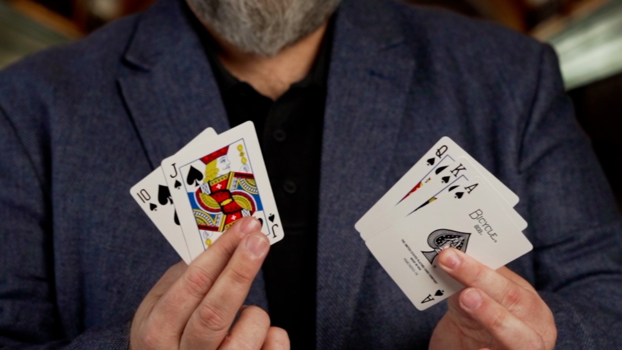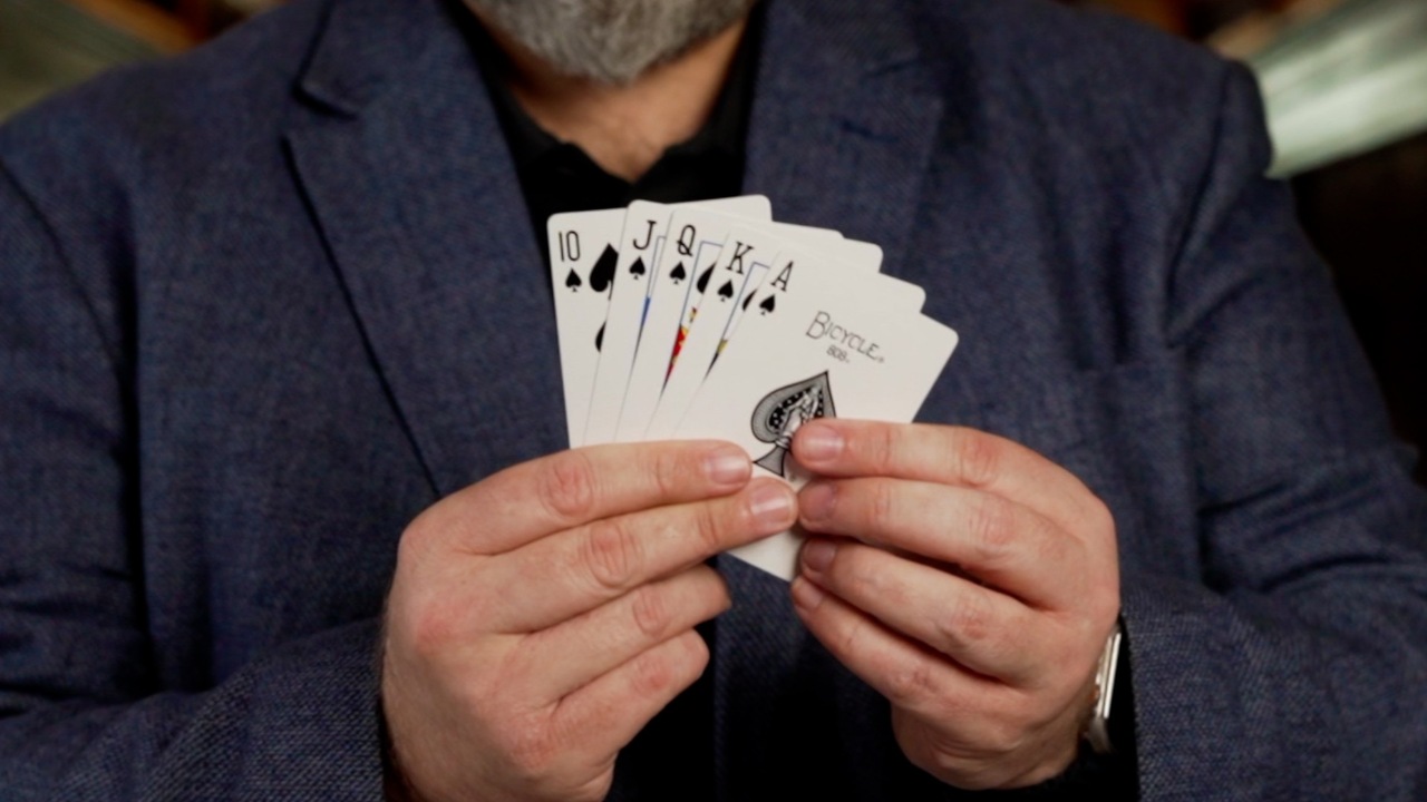 This stunningly visual effect allows you to show a terrible five-card poker hand. Then, in the blink of an eye, the cards become a Royal Flush. The cards can then be immediately handed out for examination. There are no moving parts, elastics, or strings to break. The gimmick is a thing of genius and has been carried in the wallets of pros for years.