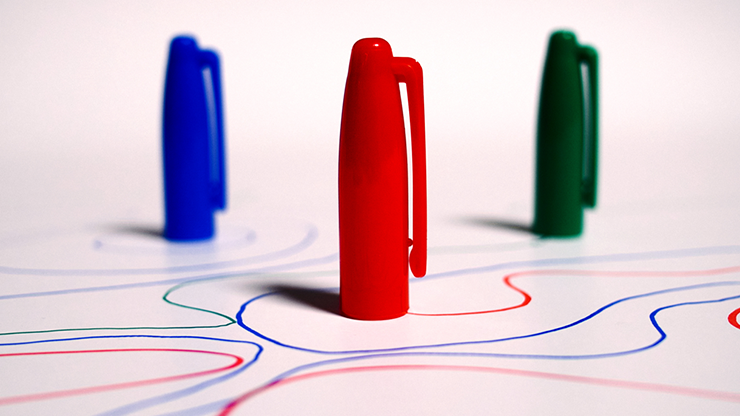 You introduce three pens, each clapped with a black lid. While your back is turned, your participant places each pen in a different pocket. You can explain that despite their black black appearance, each pen is actually a different colour. From your right pocket you produce a red lid, from your left pocket, a green lid, and from your back pocket, blue. Remarkably, when the participant takes the pens out of their pockets and uncaps them, they discover they've matched the same colours to the same pockets.