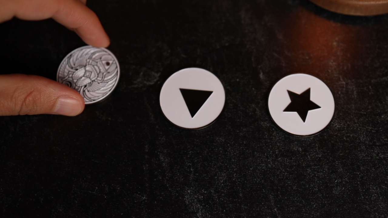You reveal three metal coins and a prediction out of a velvet bag. The coins have a star, a square, and a triangle on one side and an Egyptian-inspired design on the back. Your spectator makes all the choices. They choose one token to go in the bag, one token for them to hang onto, and one token for you to hold. When the prediction is revealed, it perfectly matches every single prediction the spectator makes. The best part? Everything is examinable.