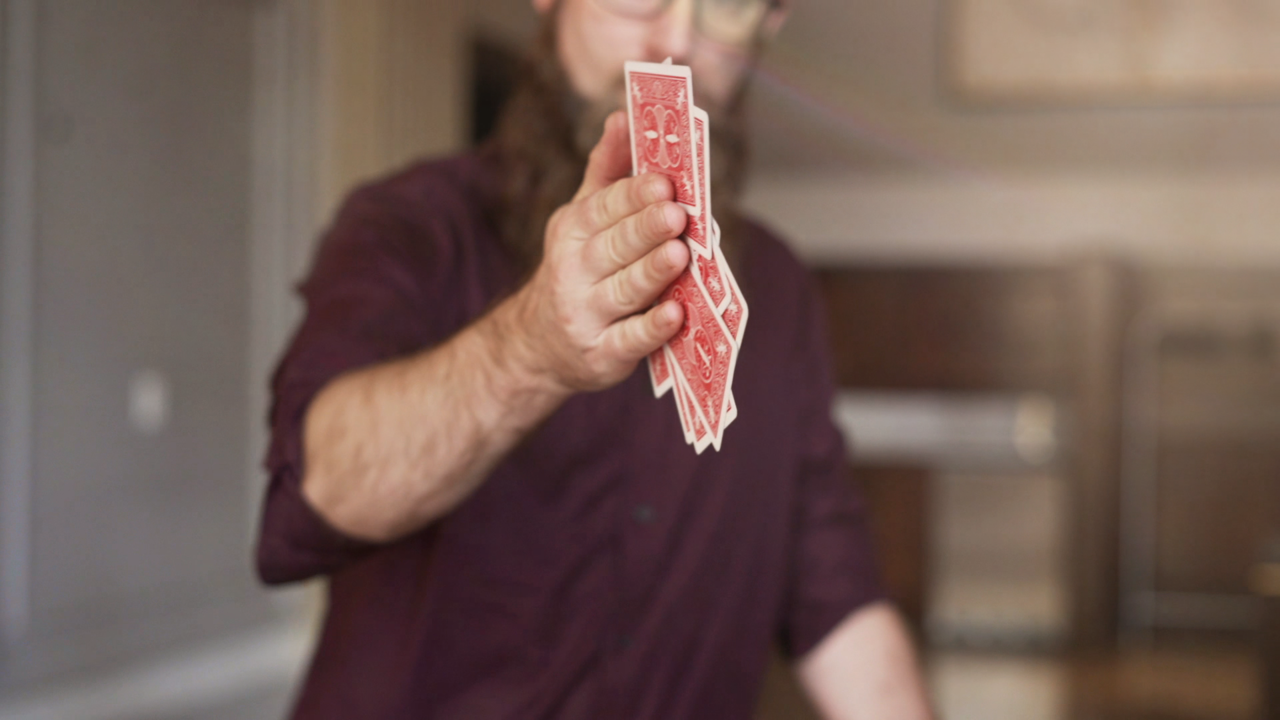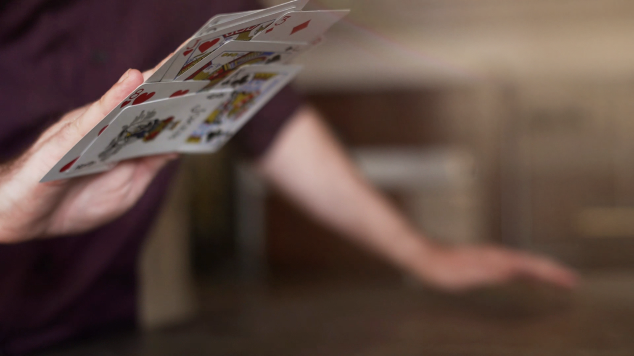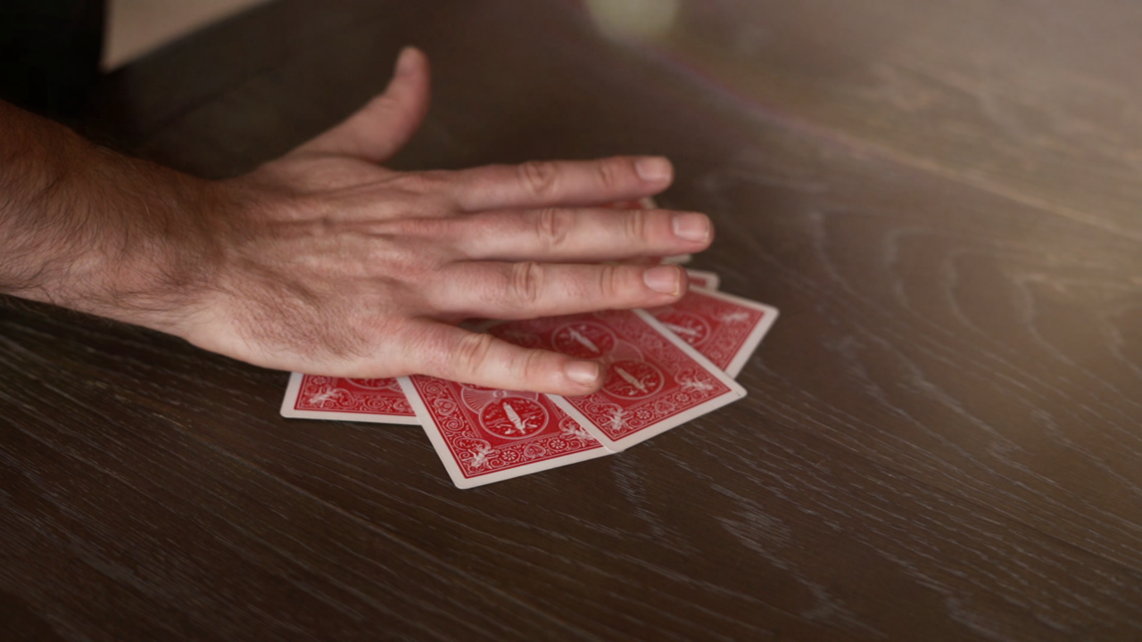 Your audience selects a card that can be signed, and then it is lost in the deck. You show them that they will shuffle the deck, grab a handful of cards from the middle of the pack, and toss them on the table. The rest of the deck is put away, and the packet of cards is spread out into a large wash on the table. You place your hand palm down on the mess of cards, take a deep breath, and when you lift your hand, all of the cards except for one stick to your hand. While the cards are stuck to your hand you can even move them around, proving they must be adhered to you by magic. The single card remaining is, unbelievably, the card the spectator selected. When you let your breath out, the cards stuck to your hand cascade back onto the table. Your hands are immediately examinable.