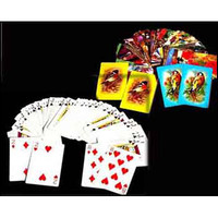 The magician displays a pack of cards which all have different back designs. He removes two cards for himself, then hands the pack to a spectator. The spectator may deal as many cards as they like onto the table and the magician places one of his cards face up at that spot in the deck. This process is repeated with the magician's other card. The magician retrieves the deck and spreads it across the table, then removes his two face up cards along with the cards right next to them in the spread. Surprisingly, even though the spectator dealt the cards himself and could stop at anytime, the magician's cards have the same back design as those right next to them! Even more amazing is the fact that the faces of cards match as well! But most amazing of all is the fact that when the magician turns the pack face up and spreads it across the table, all of the cards are seen to be black court cards!