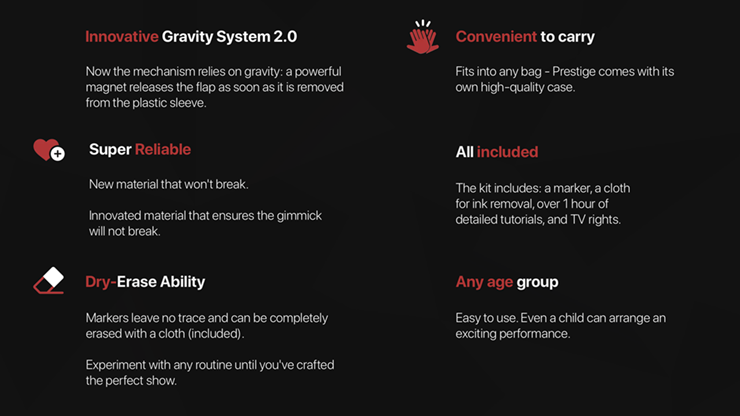 "It's clever, it has so many possibilities!"- Kevin James"I'm glad I bought it and will use it."- Jeff Hobson"Already implemented this in my shows and it kills!"- Kevin Li"One of the best tricks of the year!"- Les French TwinsPrestige is bestseller of 2021 year! The possibilities are incredible, it can used for comedy magic, evoke emotional responses or anything else.Some possible routines: