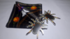 COMPLETE WITH 2 (TWO) CUT OUT SPIDER FIGURES (APPROX 6 INCHES X 6INCHES/ 14CM X 14CM) AND A LENGTH OF BRIGHT ORANGE "SPIDER WEB" THREAD.
