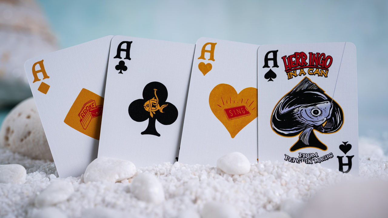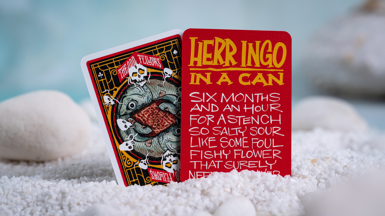 The beautifully-embossed full color tuck box is inspired by the can designs of this special delicacy. The Herr Ingo mini deck may be only half the size of a poker sized deck, but it is still just as potent!