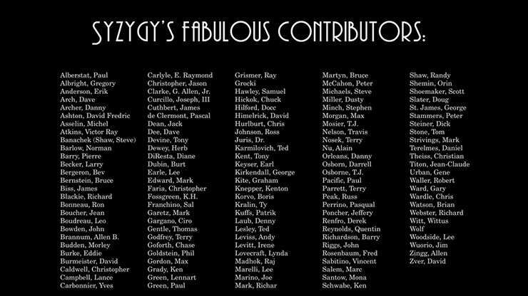 There are very few publications that can legitimately claim they have altered the way Mentalism is presented; SYZYGY is one of them. Editor Lee Earle accepted contributions to the newsletter on matchbooks, cocktail napkins, telephone calls, and scribbled legal paper and then rewrote them all, supplying his wordsmithing expertise and professional entertainer's perspective that Mentalism is about the audience and not the performer.