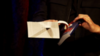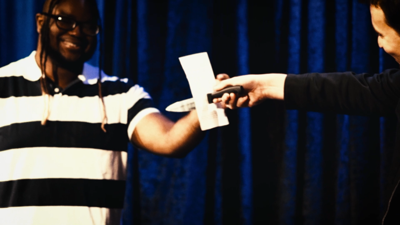 3. The knife is pulled straight down, cutting through every single page... except one!! Impossibly the page your audience thought of is clearly seen impaled on the knife!!! They can keep the page and everything can be easily reset in a few seconds.
