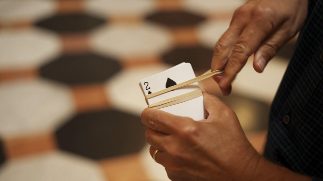 2. The deck is rubber-banded and then handed out to the audience.
