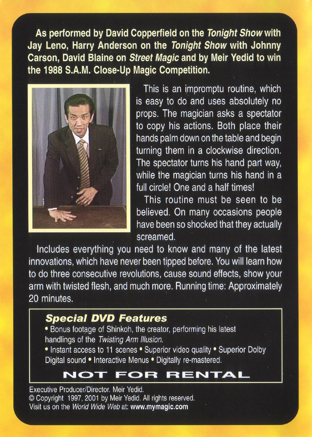 This is an impromptu routine, which is easy to do and uses absolutely no props. The magician asks a spectator to copy his actions. Both place their hands palm down on the table and begin turning them in a clockwise direction. The spectator turns his hand part way, while the magician turns his hand in a full circle! One and a half times!
