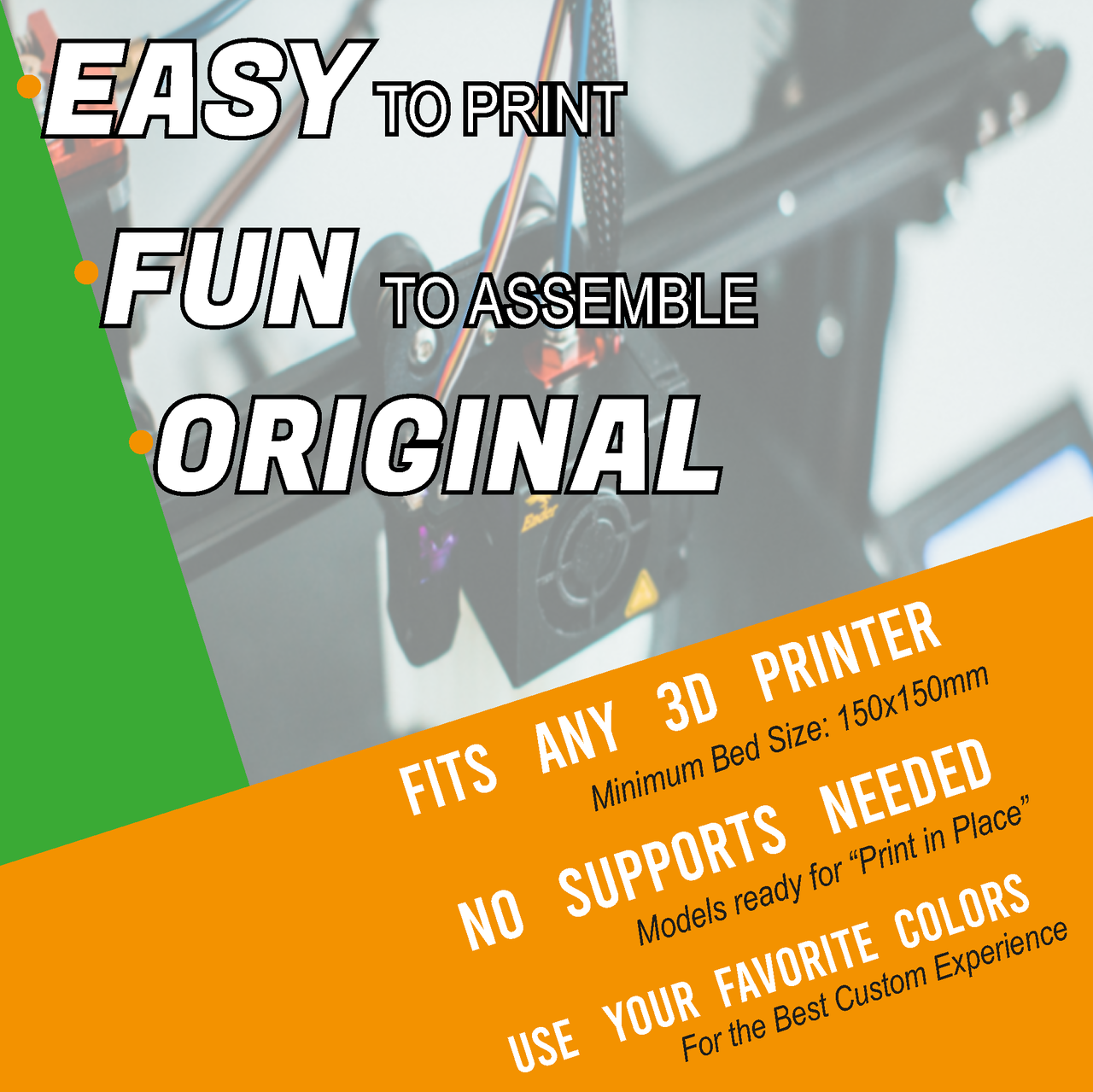 Choose the colours and start printing on any 3D printer with at least 150x150 mm Bed.