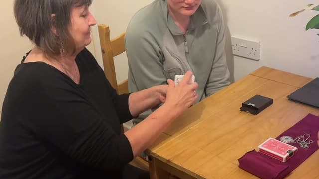 “Now please hold your deck just for now, what I would like you to do I will demonstrate. I want you to open the deck in a moment when my back is turned. I want you to go through the deck and take out your card you’re thinking of, place it on the deck and shuffle it into the deck . Then place the cards inside the card case and tell me to turn around “