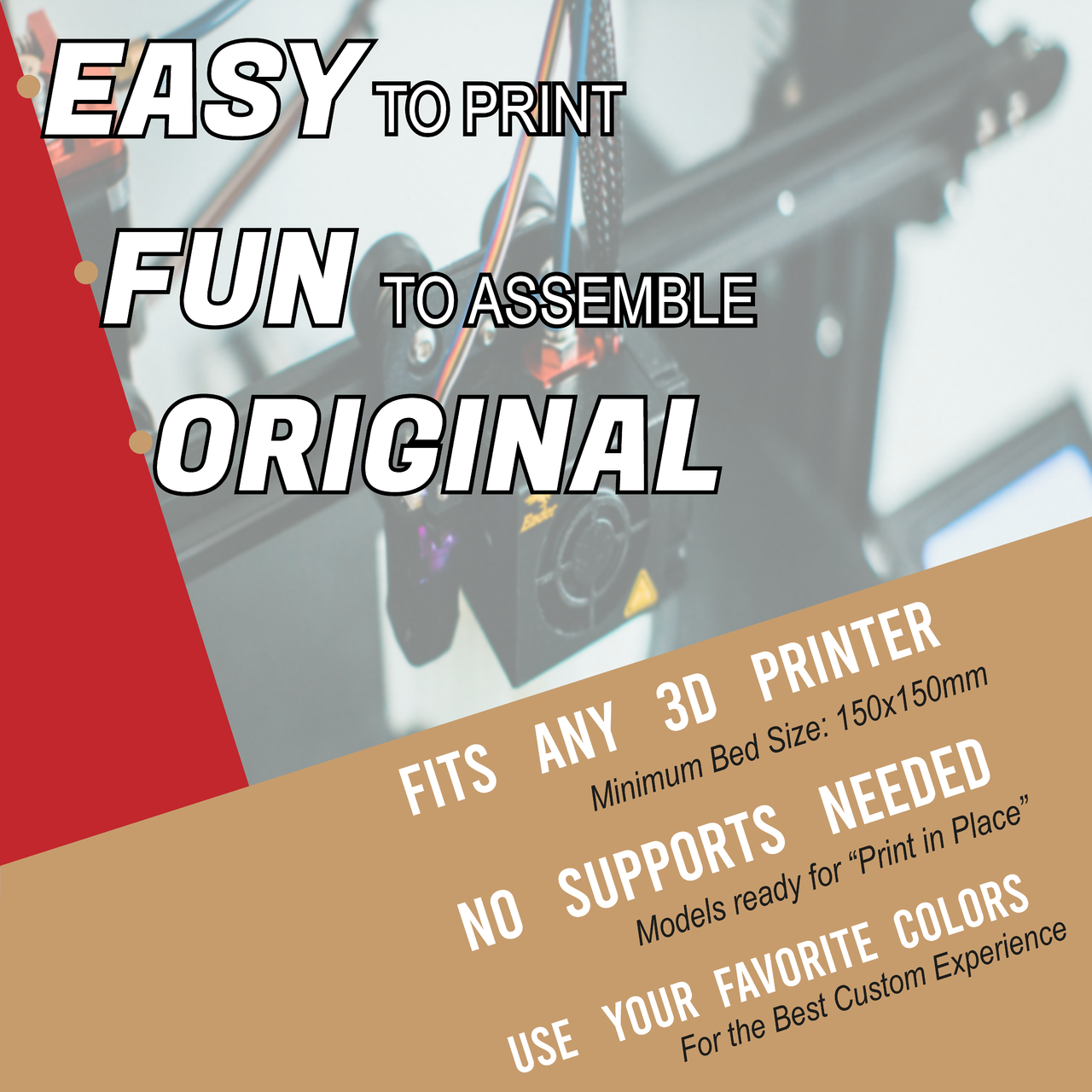 Choose the colours and start printing on any 3D printer with at least 150x150 mm Bed.