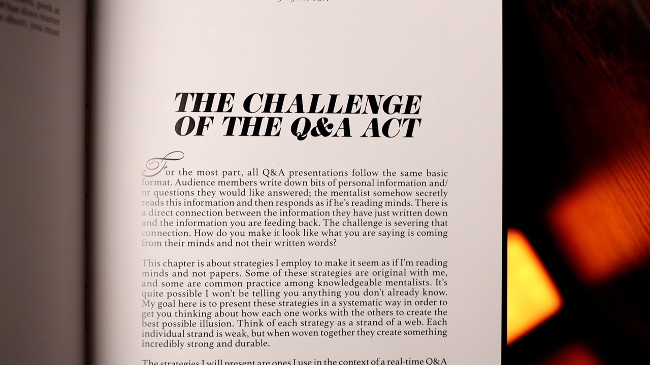 Q&A - Bob Cassidy has referred to the Q&A Act as one of the “major effects” in mentalism. Chris feels Q&A is the "only effect" in mentalism. Few people have performed the Q&A as much as Chris has, and the true treasure in this book is the insights he reveals to you about the act. Chris shares the true secrets, which aren’t about how you get the information, but what you do with the information when you have it. The techniques in this section will benefit anybody who does Q&A or “Audience Reading,” regardless of the method they use.
