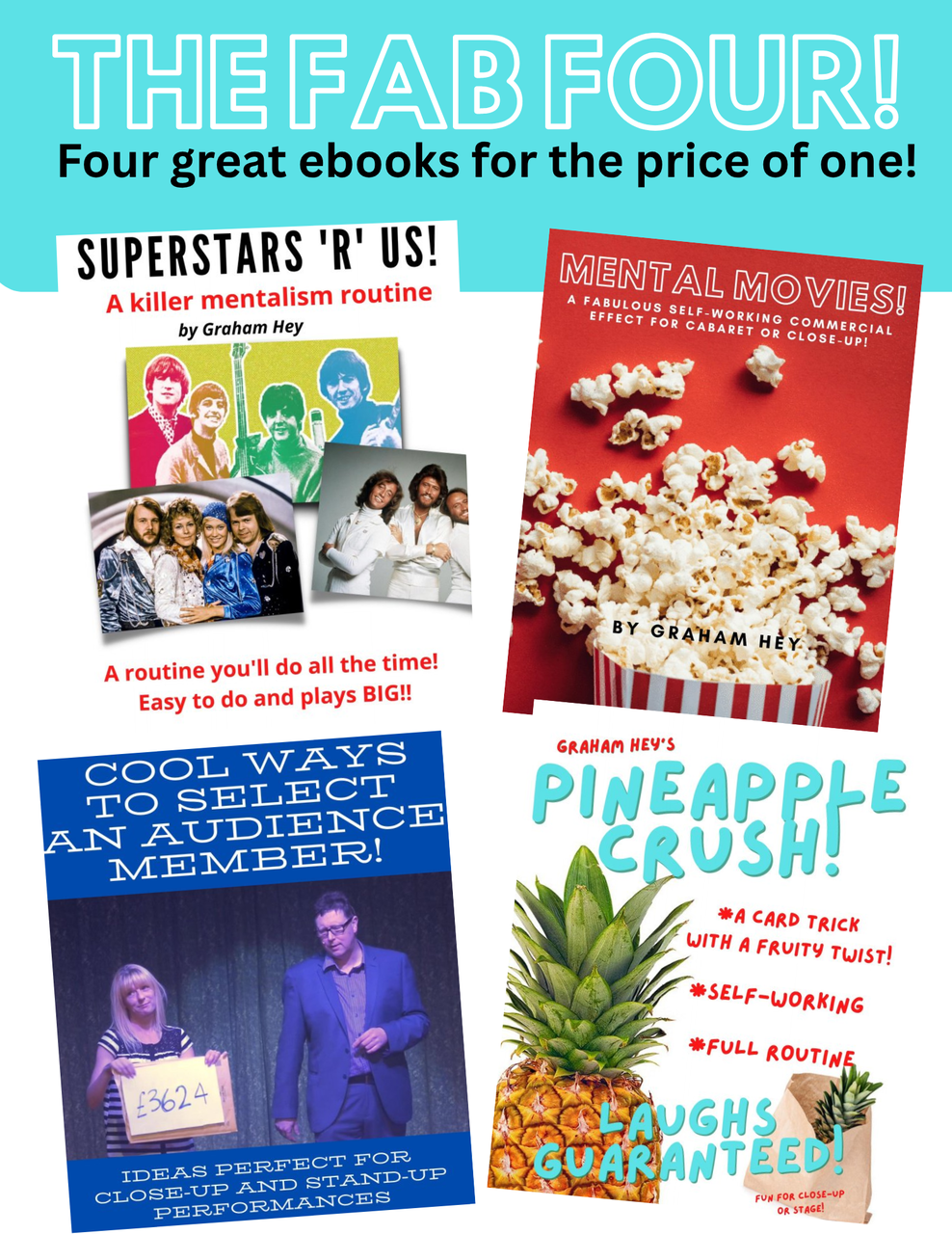 Four fabulous ebooks featuring killer mentalism routines and lots of fun cool ways to get a spectator to help you! Suitable for close-up and stand-up.