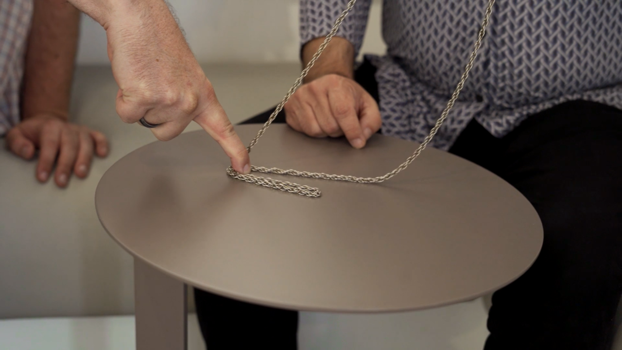 In Fast & Loose, a beautiful silver chain is thrown into a figure eight pattern. The spectator is invited to place their finger on one side or the other of the figure eight. When the chain is pulled, if it loops around the finger, it’s a win, but if it pulls loose, then it’s a loser. The chain is always pulled from the center in the same way, but no matter how closely the pattern is examined, the spectator can’t win. The secret lies in the special patterns the magician can throw that look identical but contain a diabolical topological secret.