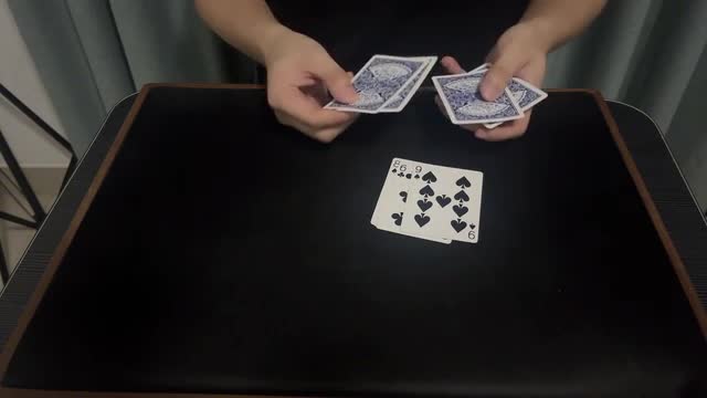 Transfer Oil and Water: Four red cards and four black cards are interlaced. They instantly separate. Not only can they separate, but the red and black packets can also transpose in the hands. The routine ends with an unexpected climax.
