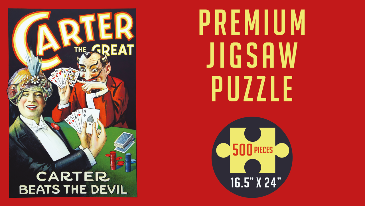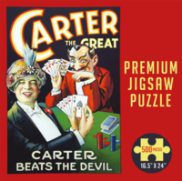 Carter The Great Classic Magic Poster Jigsaw Puzzle is a high-quality 500-piece jigsaw puzzle printed on art-quality paper and premium backer board. Measuring 16.5" x 24", this Jigsaw features a portrait of a gorgeous rendering of one of Carter The Great’s most famous show advertisements.