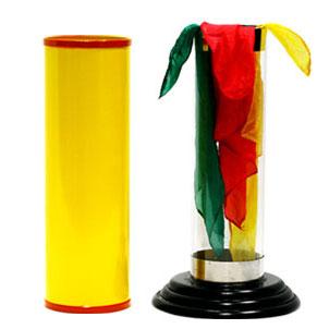 Several colorful silks are placed into the Crystal Silk Cylinder. The Cylinder is then covered with a yellow tube and then quickly removed, the silks have disappeared with the Cylinder now full of balls, candy or even live gold fish.