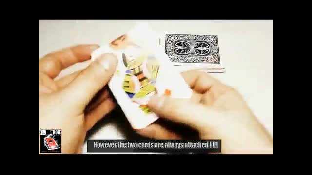 Now you explain to your spectator that nothing can pass through the joined cards without tearing the label. The proof: invite your spectator to take a card from the deck, sign it, and place it between your two attached cards. His card is still visible through the hole in the red card but as the spectator will note, the label prevents all passage.