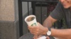 sleeve and tears off a piece and puts it on top of the cup as he demonstrates static electricity.
