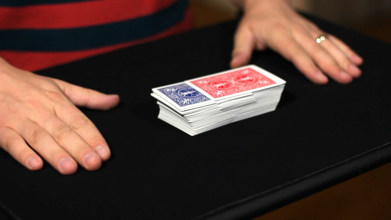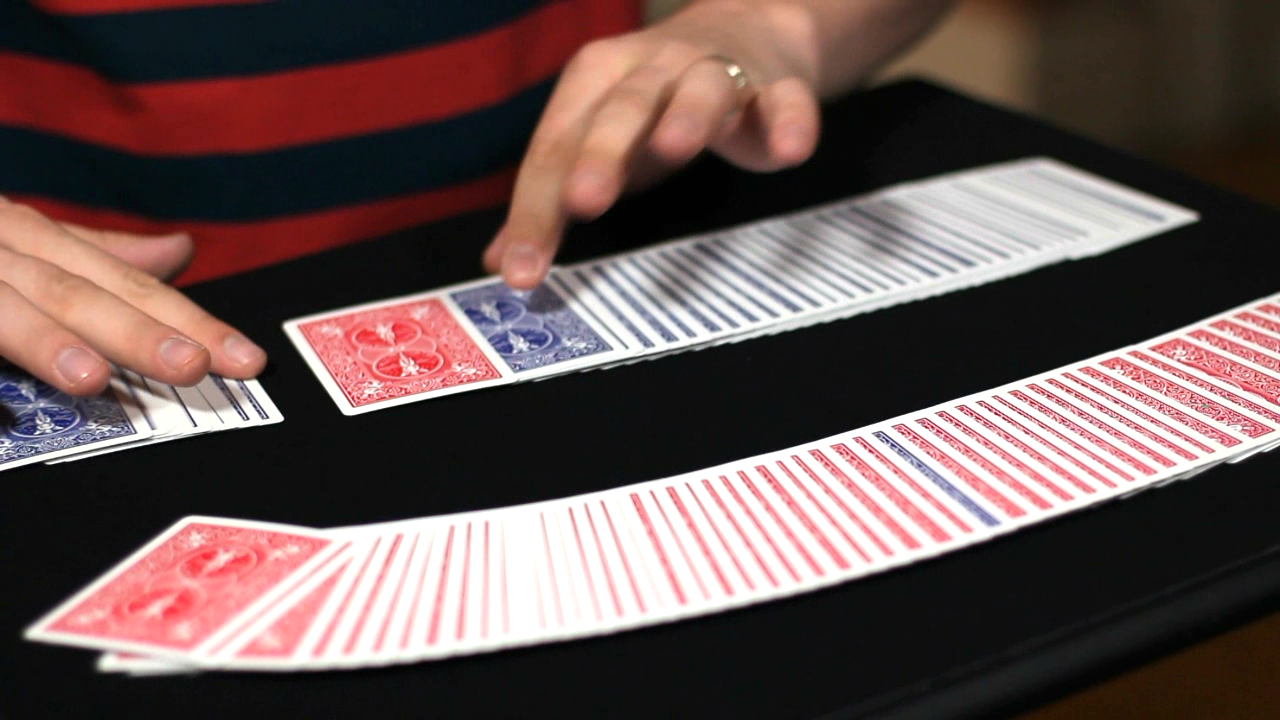 On your command, INSTANTLY, the cards separate themselves by color, with 2 exceptions -- the two chosen cards. The kicker ending is that the selections have traded places. In the middle of the red deck is the blue card and in the middle of the blue deck is the red card.