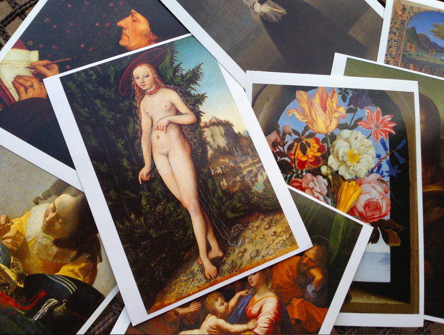 You can perform Self-Guided Tour with postcards, tarot cards, photographs, or playing cards. Whatever fits your personality and style. I use postcards from the Louvre, and my presentation goes like this: