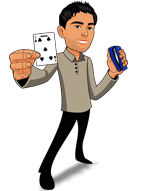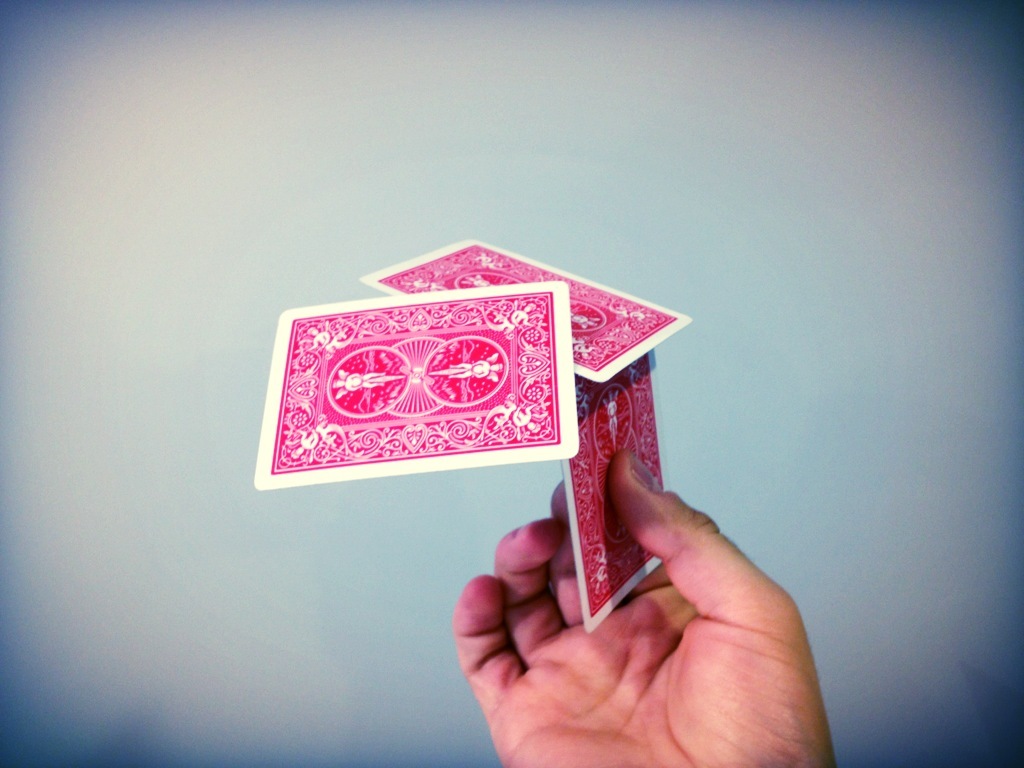 A spectator freely selects three cards from a borrowed deck. The cards are balanced, one at time, into an impossible sculpture defying the law of gravity.
