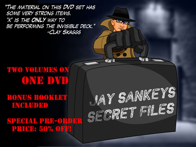 25 AWESOME magic and mentalism effects for ALL SKILL LEVELS! Originally released almost 10 years ago, a recent world-wide survey of Jay's fans revealed that 'SECRET FILES' is one of Jay's most popular DVD projects- EVER! Learn 25 KILLER effects with playing cards, paper matches, aspirin bottles, keys, note pads, coins, stickers, newspapers, sugar packets, handkerchiefs, match boxes, flash paper and more! [Read the complete list of effects at the bottom of this page!]