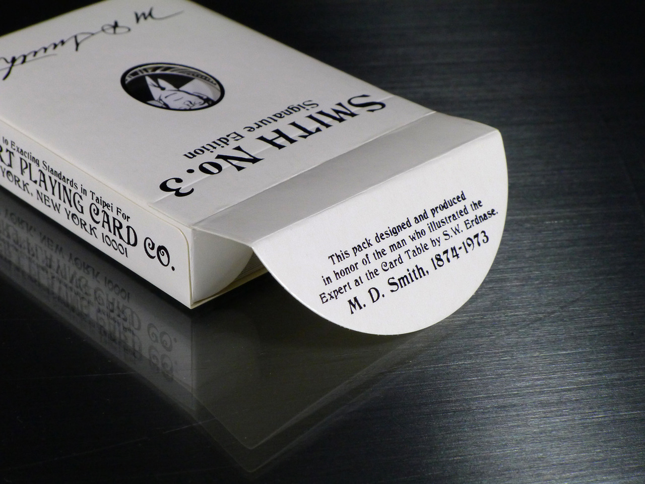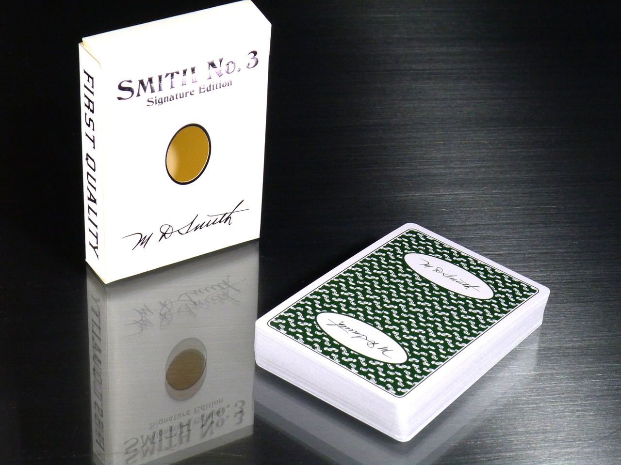 Smith No. 3 by The Expert Playing Card Co. is the final installment of Conjuring Arts' Erdnase 1902 series. This deck has the Smith hands pattern (by Guy Hollingworth) with two casino style ovals that have M.D. Smith's signature on them. This signature was taken from a copy of Erdnase we have in our library. The Ace of Spades has a rendering of Mr. Smith's face (like Willis Russell used to do) and the tuck has a die cut hole so you can see Mr. Smith while the deck is closed. Don't miss out on this chance to complete your Erdnase 1902 series!