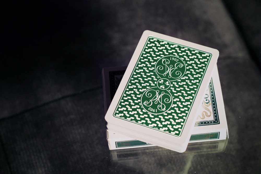 These are an updated edition of one of our best selling decks featuring some alterations to the design for aesthetic as well as deceptive purposes. The cards feature a modified Acorn back design in green, with faces representative of the 1902 period. Available in both Cambric (embossed) and Ivory (smooth) finishes.