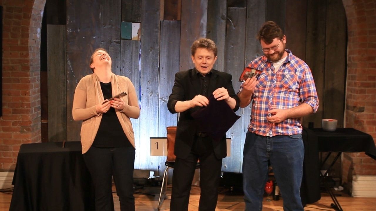 Quiz Show. So much entertainment packed into a routine using the most simple method. 2 spectators are used to compete in a ridiculous quiz show. The spectators blindly select questions from a bag. One spectator always picks the easy question and of course one spectator picks questions that are impossible to answer. This is a hilarious plot but as always Tom gives it a very magical conclusion when he produces and final prize.