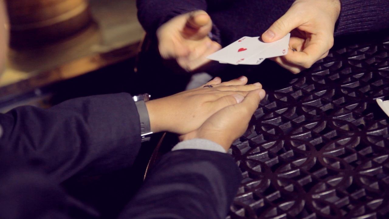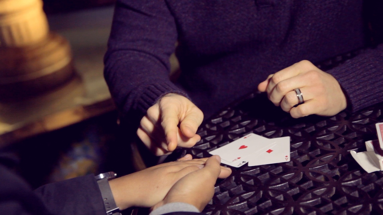 places with an ace - while trapped between the spectator's hands. The routine for Ian's handling is