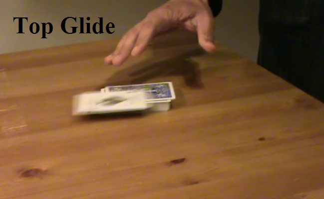 The magician places a card on the top of the deck and lays the deck face-down on the table. The top card suddenly glides off the deck.