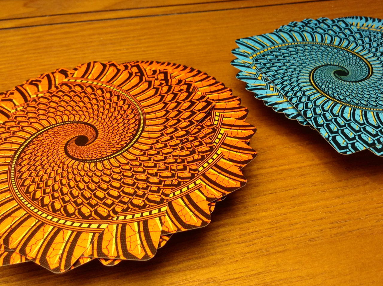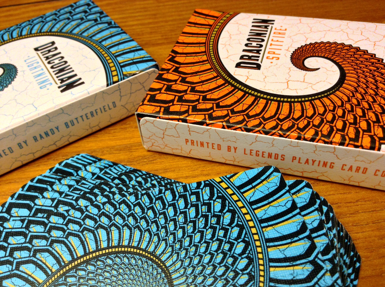 Inspired by Dragons of lore, Draconian Lightning (Blue) and Spitfire (Orange) are a premium pair of custom Playing Cards.
